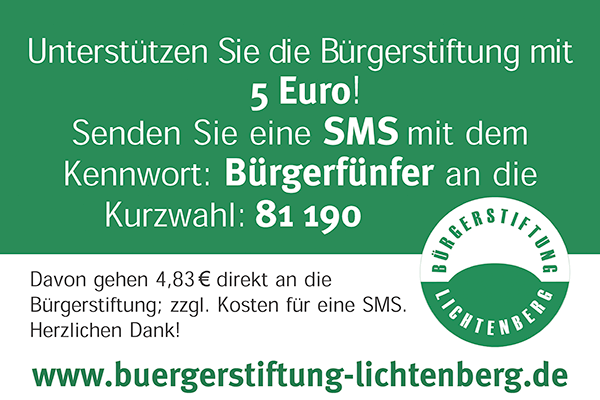 Dazu kommt mit „Helfen per Charity SMS“ nun noch etwas Neues. Niederschwellig, unkompliziert und mit einem auf 5,- Euro pro SMS begrenzten Betrag, ist es ein Unterstützungsangebot für unsere Stiftung an alle, denen Lichtenberg und die Förderung des Ehrenamtes und seiner Projekte am Herzen liegt.